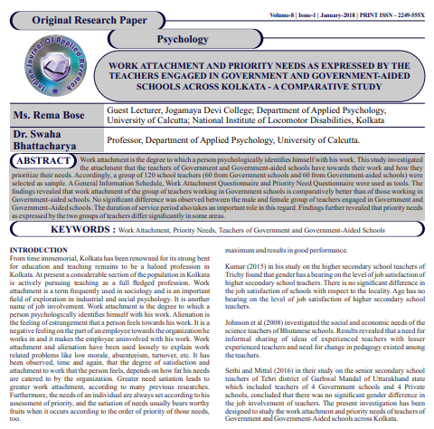 Maahirii, PhD in Applied Psychology from the University of Calcutta and a first class first Gold Medalist in Post Graduation (University of Calcutta), has been into lectureship from 2010. She is a regular faculty of psychology in the National Institute for Locomotor Disabilities (NILD) in Post Post-Graduate Department of Disability Management and Departments of Physiotherapy, Occupational therapy and Prosthetics & Orthotics.